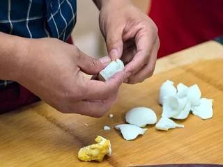咸鸭蛋去壳,蛋黄碾压成泥,蛋白切碎。