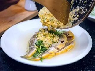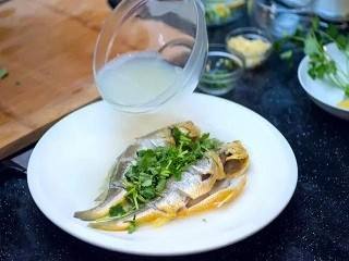 黄鱼放在盆中,撒上香菜,倒上汤汁。
