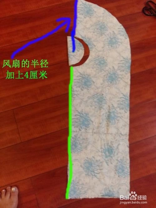 把其中一块布料按下图对折,量出风扇面罩的半径,剪一个圆洞出来,圆洞的中心到布料的上圆部分就是风扇面罩的半径加上4厘米。这个洞是风扇后面的电机的位置。画绿线的地方剪开。剪开的地方卷边。