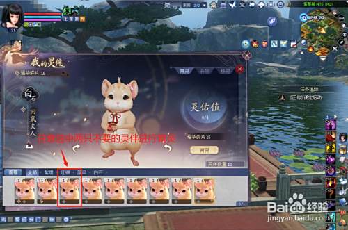 首先点击灵伴图标进入灵伴系统界面后,先任意选中两只不要的灵伴进行育灵操作(一次只能操作一只,所以要分两次完成)。