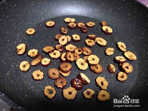 枣片也放入不粘锅,小火炒至表皮微焦。
