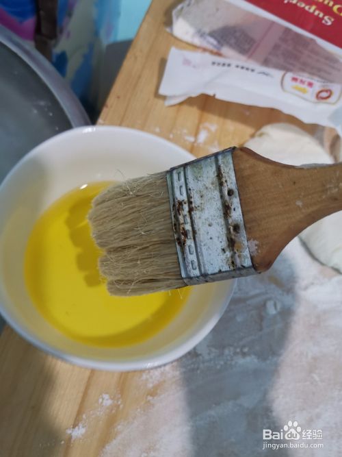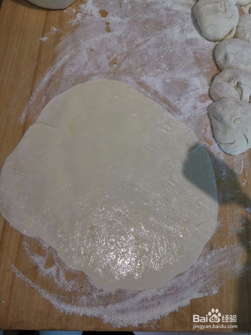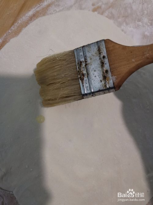 然后擀好的面饼放在面板上,刷上一层又后,下一张擀好的面饼放在刷好有的面饼上