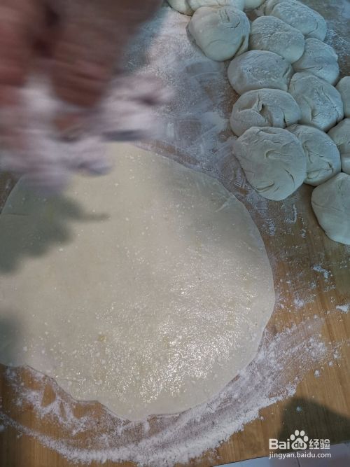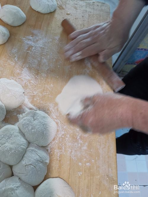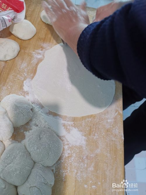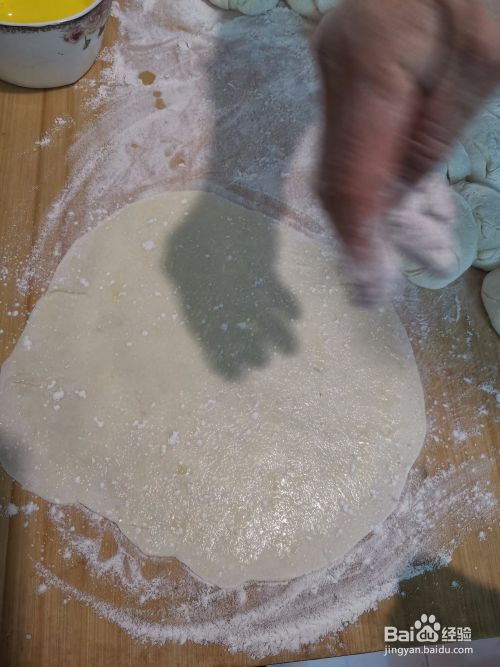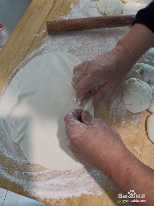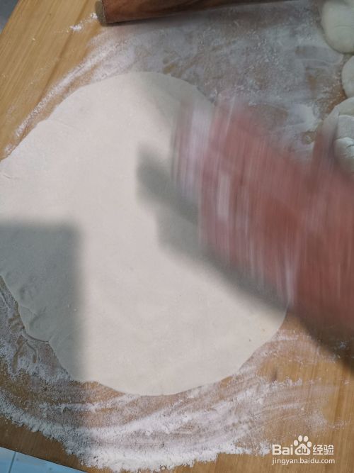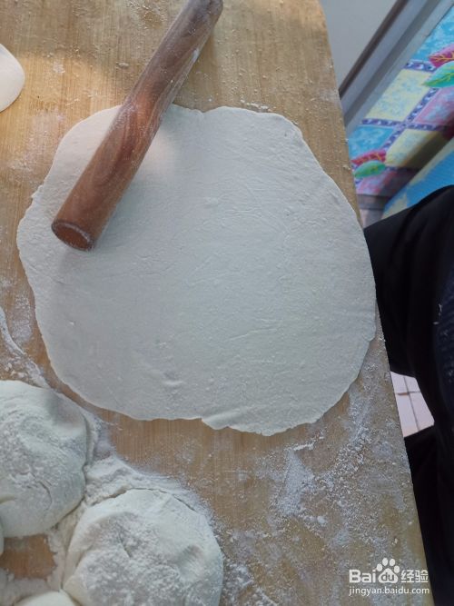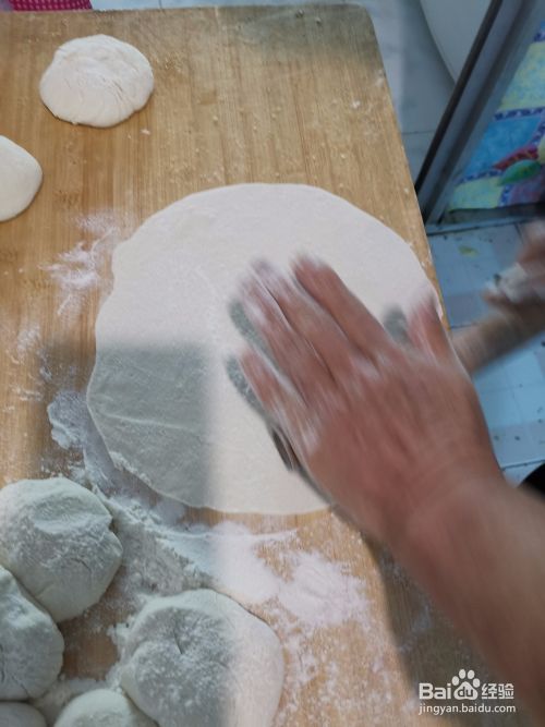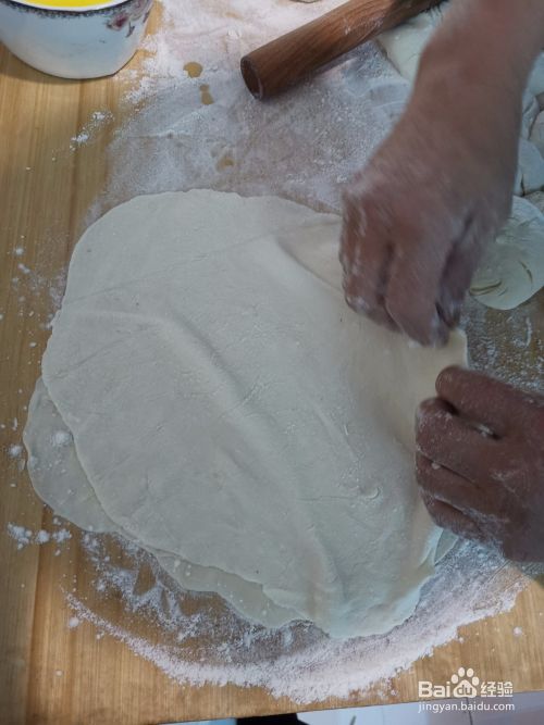 将面段压一下,然后用擀面杖,将面段擀成薄饼