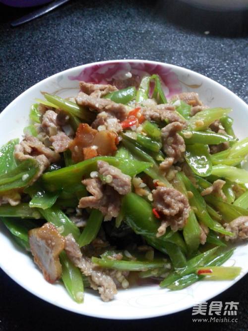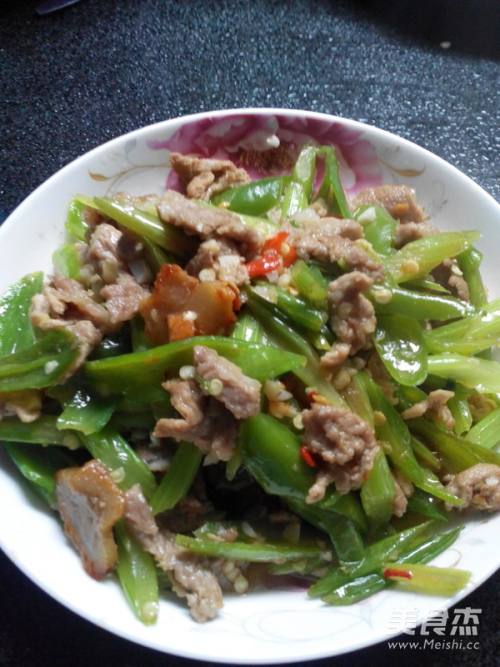 1切好辣椒,芹菜,肉,大蒜,如图片样。另瘦肉用生粉拌下。