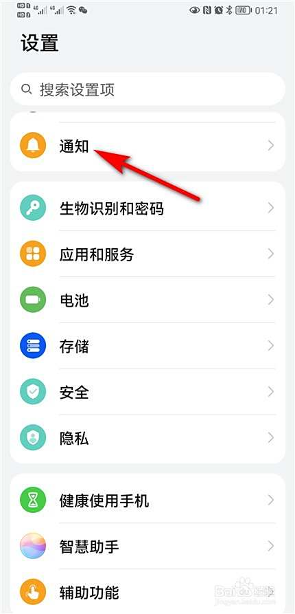 返回手机设置页面,点击通知。