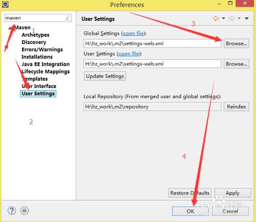 回到eclipse——》preferences的窗口中,搜索maven,选择user setting,点击global setting右面的browser选择maven依赖库路径中的setting-web.xml文件,选中,然后下面的local Responsitory会随之改变,这样依赖库就设置成功了