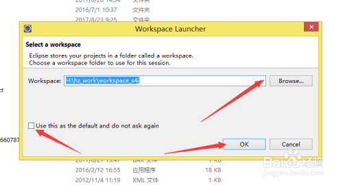 然后在弹出的窗口选择项目工作空间,点击ok,还可以点击左侧复选框设置默认工作空间,这样以后启动eclipse就直接进入项目了