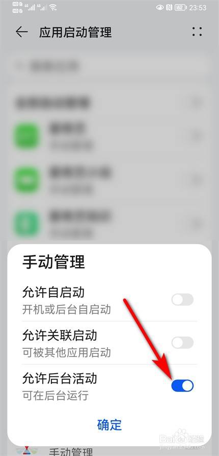 页面弹出选项,选择允许后台活动,再点击确定即可。