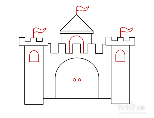 接着给城堡画一些装饰如大门的门缝及把手,塔楼和城楼的门窗,以及城堡上飘扬的旗帜。