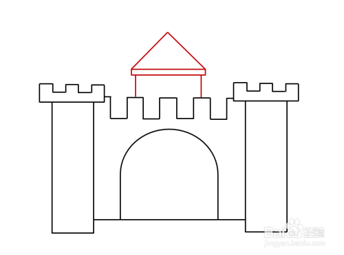 在中间的城垛上方画上城楼,城楼由两个两根直线一个长方形和一个三角形构成。