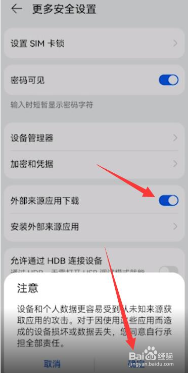 进入更多安全设置页面,将外部来源应用下载按扭打开,点击确定。