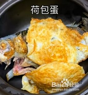 然后将煎好的鱼放入砂锅,再放姜片和葱段,荷包蛋1个,白萝卜丝