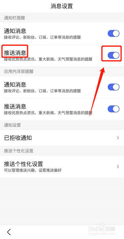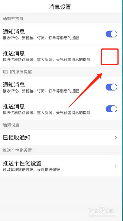 接着可以看到通知栏下方的推送消息,可以看到旁边的按钮是打开的