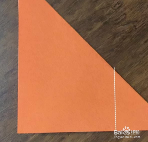再取一张正方形的纸,沿其中一条对角线对折成三角形,如示例图摆放,然后沿着虚线向左折,但不用完全折过去,停留在中间即可。这一步骤是折出猫咪的身体以及尾巴。