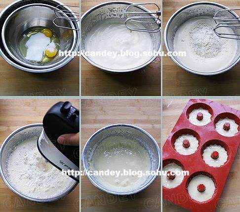 准备工作:<br>1、低筋面粉和泡打粉混合过筛;<br>2、将模具内壁刷油。