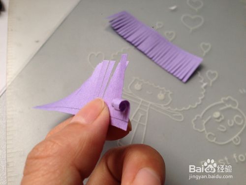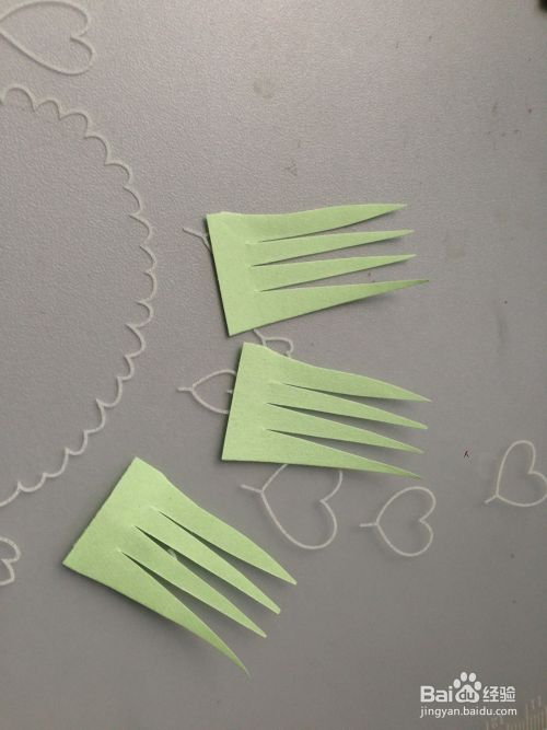 将剪好的等宽小条按图所示卷起来,卷好之后再把小卷打松。将绿色纸条剪成叶子的形状