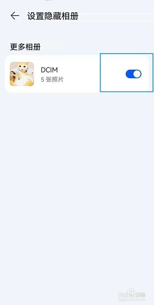 进入“设置隐藏相册”界面——点击需要隐藏的相册开关按钮,按钮变成“灰色”即设置完成。