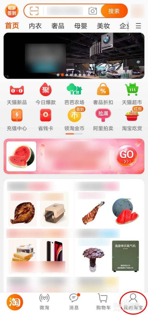 打开手机淘宝APP,默认打开首页,商品琳琅满目,选择右下角我的淘宝。