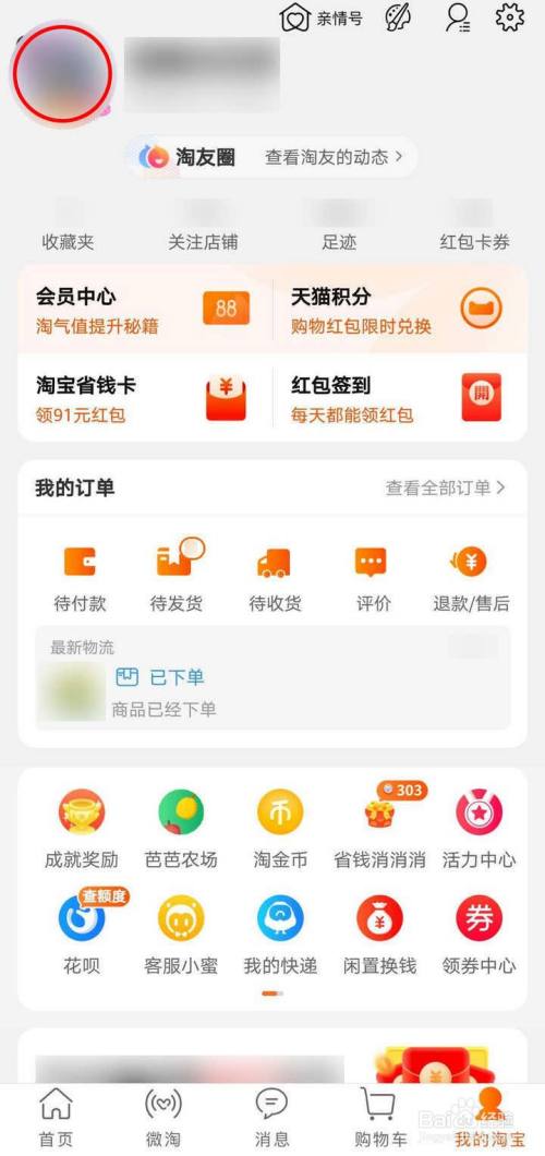 进入我的淘宝页面,我的订单就在这里查看,选择左上角的头像;