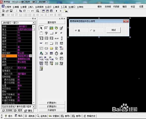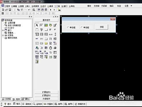 在创建好的窗口上,绘制两个”单选框“组件、一个”按钮“组件,调整好单选框组件的大小和位置。如图: