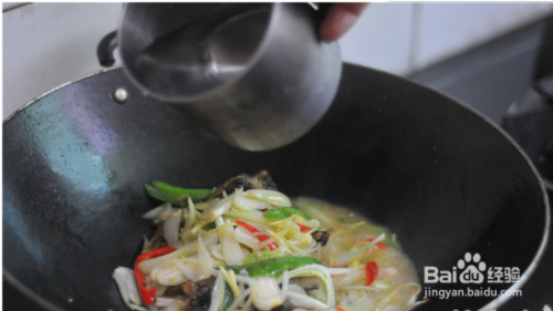 沿着锅边淋入水,将青红辣椒和姜丝撒在上面
