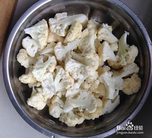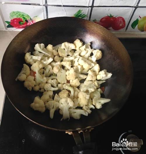 4、重新倒油,再将菜花倒入锅中大火翻炒2分钟,可以加盐,不过我是习惯加味极鲜酱油,上色不重,味道还可以,还不需要再加其他的调料。