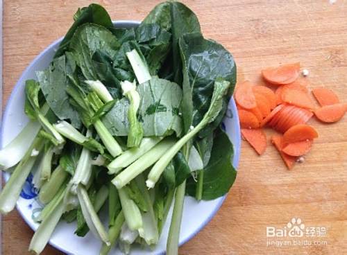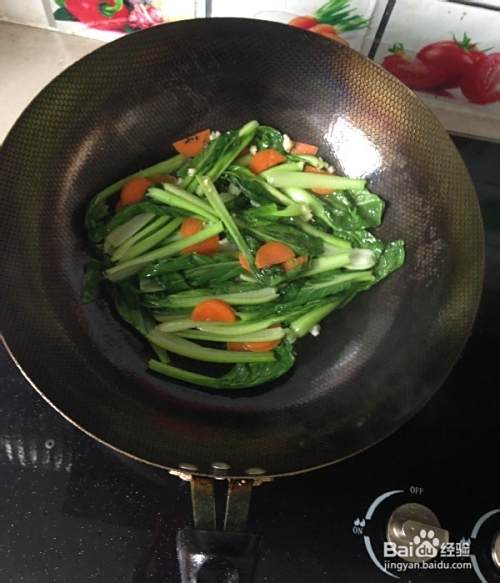 3、热油,将胡萝卜和油菜先放入锅中大火翻炒2分钟,然后盛到盘中。据说胡萝卜的营养炒一下更容易吸收。