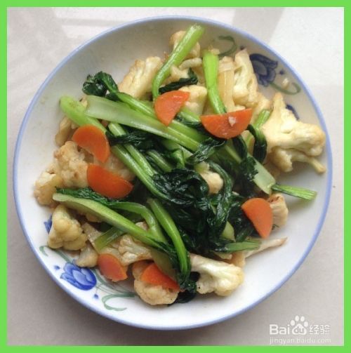 6、好吃的营养蔬菜完成了,一起盛到盘子里,颜色还可以哦,可以让宝宝吃饭啦。