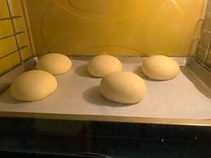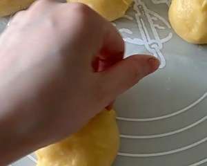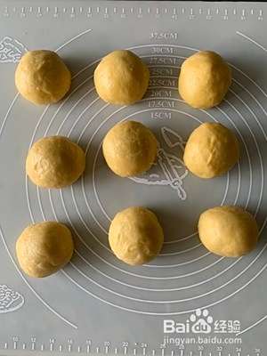 发酵好的面团取出按压排气,分成九份(每份约77克)逐一滚圆;