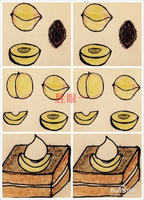 黄桃是一种笔者胜眼一跟家人都比较喜爱的水果之一。笔者胜眼一画的这幅画黄桃果肉瓣整个画面的布局是两个完整的大个黄桃,还有三瓣四分之一的黄桃瓣,一瓣二分之一的黄桃果肉,一个桃核,一块黄桃果肉做的蛋糕。