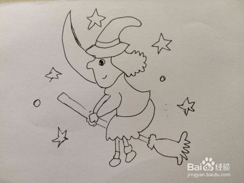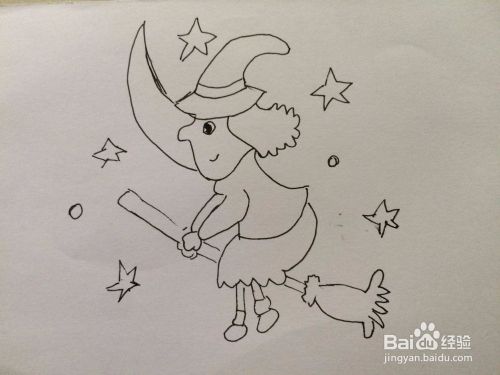 最后在脸傍画好一个大大的月亮,还有许多漂亮的星星。这样骑拖把的巫女就画好了。