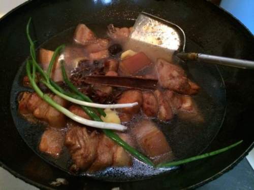 11加葱姜,八角、桂皮,草果。加入水,使其没过肉。