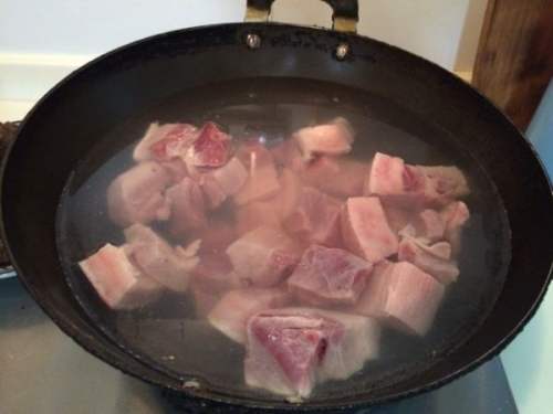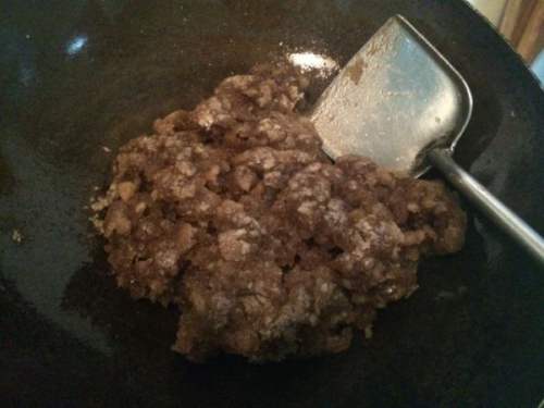 10加入焯过水的肉,迅速搅拌,让肉均匀上色。