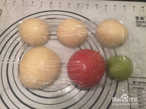 将面团排好气,原色面团分的4小份和1大份,1小份加入抹茶粉揉匀(因圣诞爷爷只需一半面团量,3小份我做成了吐司)