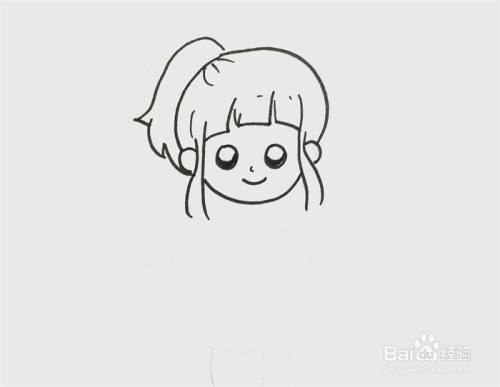 首先先画出动漫人物额头前的头发,往上画出马尾,画出脸两边的头发,再画出脸,在上面画出眼睛、鼻子、耳朵和嘴巴。