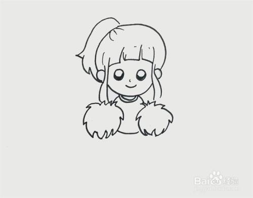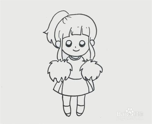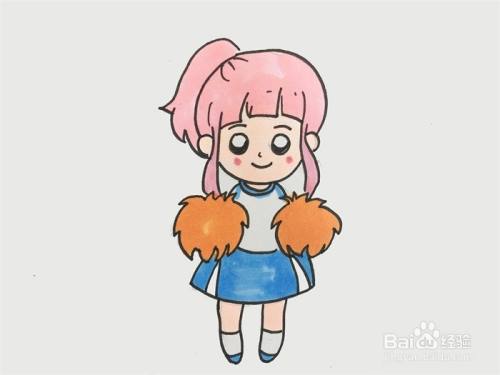 最后给动漫人物涂上颜色。给头发涂粉色,领口和裙子涂上蓝色,手摇助威花涂上橙色。一个动漫人物就画好了。