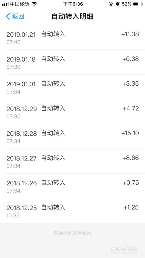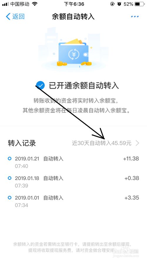 打开“余额自动转入明细”界面中会有30天的转入记录。