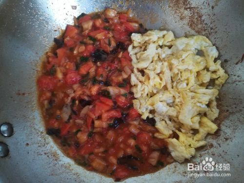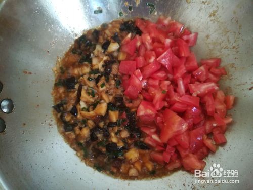 然后倒入西红柿丁不停翻炒,翻炒至西红柿出汤。