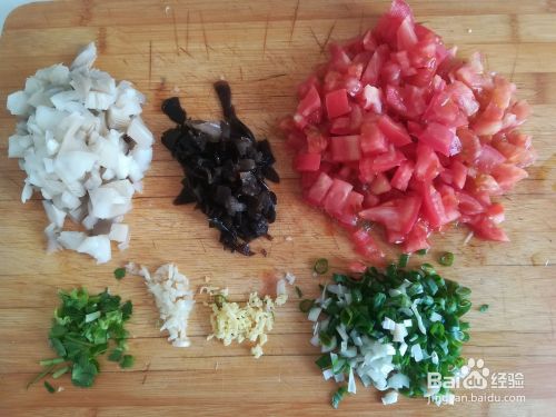 把泡发好的木耳切末,蘑菇、西红柿切成丁,香菜切段,葱、姜、蒜切末。