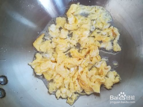炒锅里放油,等油六成热左右,倒入打散的蛋液,炒散后盛出备用。炒鸡蛋的油要比平时炒菜的油放的多一些。