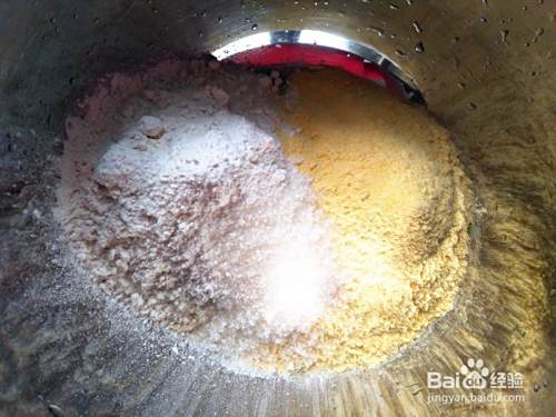 玉米粉和面粉按照一比一的比例搭配好导入容器中,加入适量的白糖