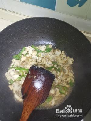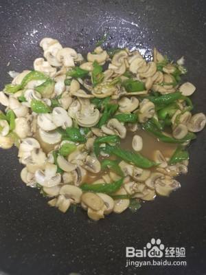 冷锅热油,放青椒炒到出一点点水(放青椒就是为了好看,可放可不放)。