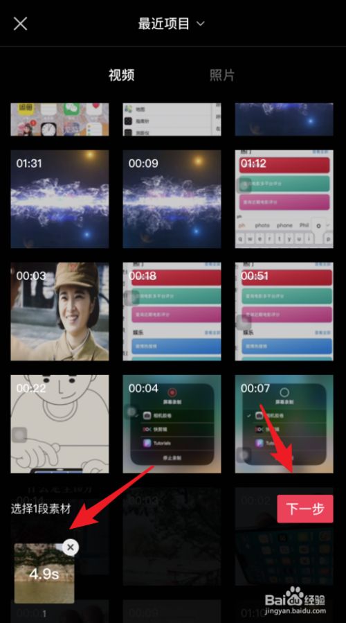 点击后,在手机内选择需要添加的素材,点击下一步。