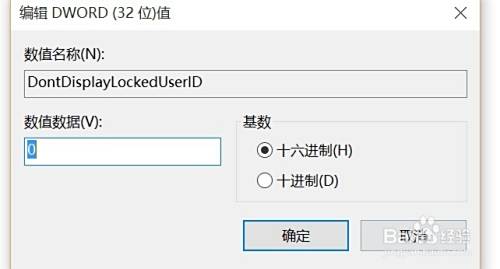 双击刚刚新建的名为DontDisplayLockedUserID的DWORD(32位)值,将看到一个编辑DWORD(32位)值的窗口如图所示