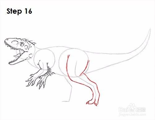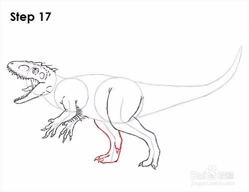 第十六步:用最右边的线作为指引,在Indominus rex身体的这一侧画腿。在您遵循指南的基本路径时轻描淡写。使用曲线来表示腿部肌肉。只有当你获得正确的腿部结构时,才能使线条变暗。从这个角度画出底部可见的两个脚趾和爪。腿部应该在顶部最厚而底部较薄。