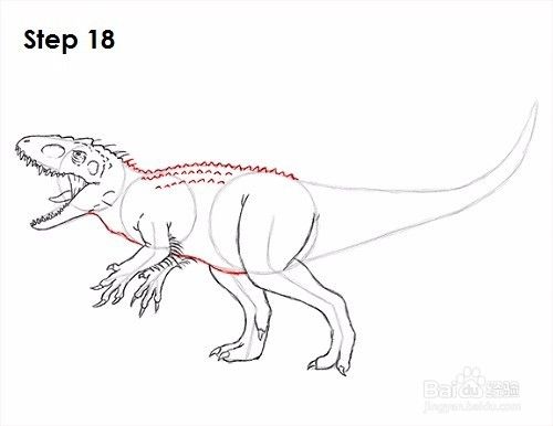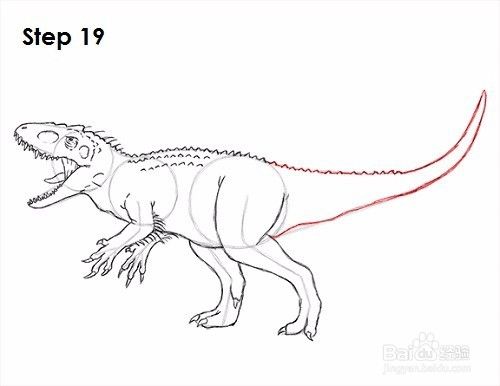 第19步:使用右边的线条作为指南来绘制Indominus rex的尾巴。绘制尾巴顶部的小三角形尖刺时,按照指南的路径行走。