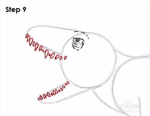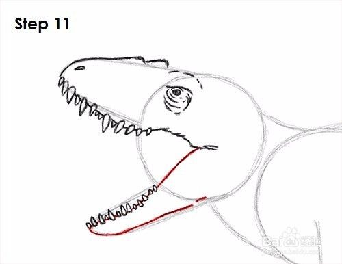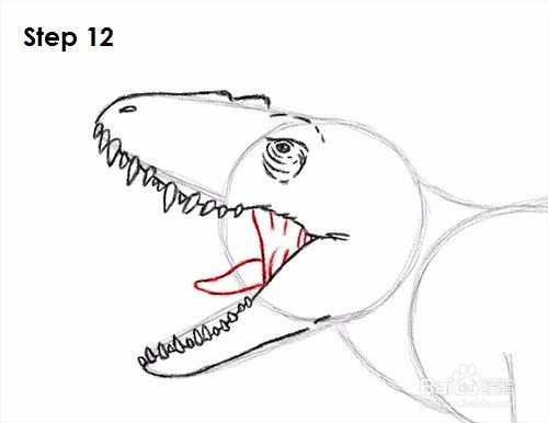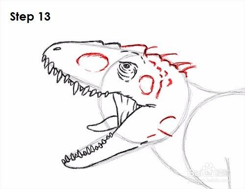 第10步:使用顶部弧线作为上颚的画法。按照弧的路径,在顶部添加一些颠簸,在Indominus rex鼻孔的前部添加一个狭缝。使牙齿之间的线变暗。这条线应该向右延伸至右后方。