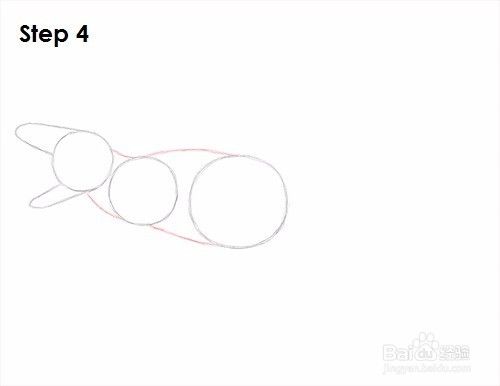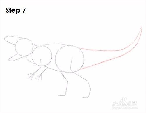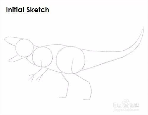 第五步:在Indominus rex的身体下方(右边的圆圈下方)画两条线作为腿的向导。弯曲线条以指示关节的位置。将各条线分开以表示向前迈进了一步。