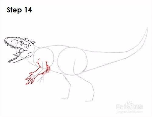 第15步:使用左侧的另一条线作为指导,在Indominus rex身体的另一侧绘制前臂。部分手臂被另一只手臂和身体阻挡,因此不要画出整个事物。只有可见部分。