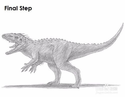最后一步:为您的绘图添加一些阴影以增加尺寸和音量。由头骨创造的凹痕很深,因此在Indominus rex的头上的圆圈中增加一个黑色值。在着色时选取光源的方向,以使阴影与其一致。首先轻微添加该值,然后逐渐增加到所需的黑暗程度。改变铅笔的压力以获得不同程度的色调值。继续在整个身体中添加值以指示阴影。